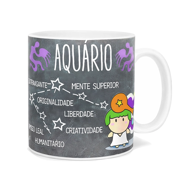 Caneca exclusiva do signo de Aquário com as principais características, a constelação e o símbolo do signo para você surpreender!